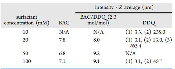 光子相關光譜(PCS)用于測定膠束的流體動力學直徑。BAC和BAQ/DDQ 2:3 mol/mol的PCS分布圖(圖1b)顯示了在相關濃度范圍內的單峰分布,平均Z平均值和單峰分布表明存在橢球或球形膠束幾何結構。DDQ呈現雙峰/三峰分布,表明膠束結構具有較大的聚集數(表4)。這可以用具有徑向長度和軸向長度的圓柱形幾何體或與單分子或多分子囊泡平衡的球形膠束來解釋。28這兩種情況與早期DDQ熒光探針研究的結果一致,該研究觀察到膠束聚集數從20增加到86,濃度從10增加到81 mM。29