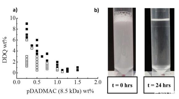 圖2:。(a)25°C下pDADMAC(8.5 kDa)/DDQ/水的相分離邊界:(□)單相和(■)兩個階段。(b)樣品pDADMAC(3 wt%)/DDQ(3 wt%)/水的相分離圖像(t=自上次攪拌以來的時間)。