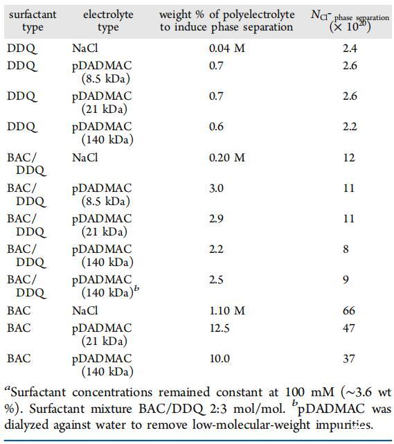 觀察到顯示分離相分離的NaCl/表面活性劑/水混合物,以產生富含表面活性劑的上層相,類似于聚電解質/表面活性劑/水混合物中的相分離。這說明,對于pDADMAC(21 kDa)和NaCl系統,可以通過改變BAC/DDQ的比率來控制相界。