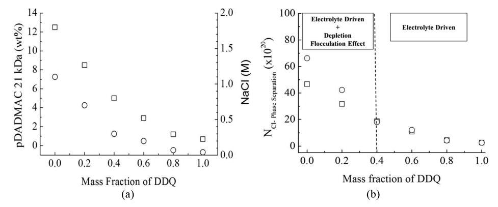 圖5:。(a)臨界相分離濃度與BAC/DDQ質量比的函數關系。表面活性劑(BAC/DDQ)濃度保持恒定(100 mM≈3.6 wt%):(○)NaCl和(□)pDADMAC(21 kDa)。(b)誘導相分離所需的電解液中氯離子的數量(NCl?相分離)作為BAC/DDQ比的函數。表面活性劑(BAC/DDQ)濃度保持不變(100 mM/≈3.6 wt%)。電解液類型:(○)NaCl和(□)pDADMAC(21 kDa)。
