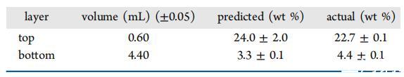 表5:。最后一次攪拌后24小時pDADMAC 8.5 kDa(3 wt%)/DDQ(3 wt%)/水的頂層和底層重量分析