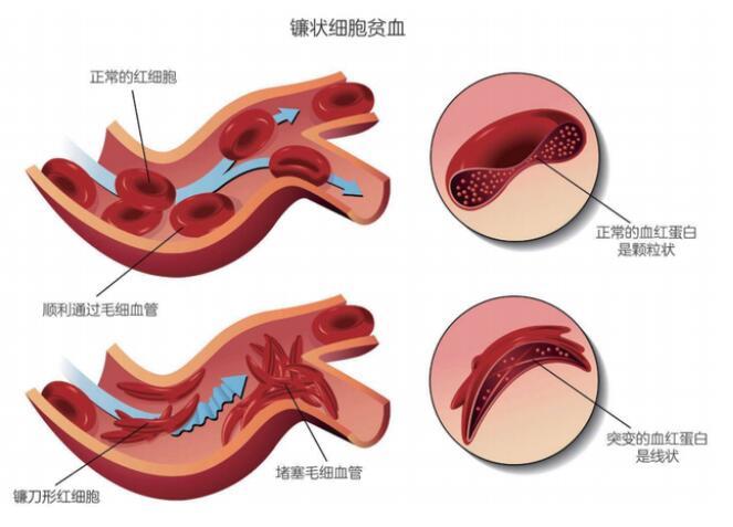我們的紅細(xì)胞原本是中間略扁的圓餅形,這下卻被又長又硬的突變血紅蛋白凝聚物撐成了鐮刀形,不但運輸氧氣的能力大幅下降,還會卡在毛細(xì)血管的拐彎處,形成大范圍的栓塞,肝臟、脾臟、紅骨髓等毛細(xì)血管豐富的組織都將受到嚴(yán)重的損傷。所以,那些從父母雙方繼承的基因都有這個突變的“純合”患者,常常會有生命危險。