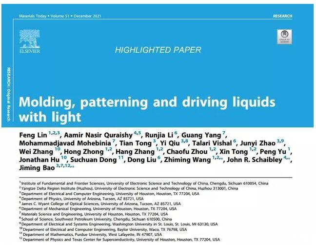該論文以電子科技大學(xué)第一單位發(fā)表在國(guó)際頂級(jí)期刊Materials Today上,并被期刊主編選為Highlighted paper作為亮點(diǎn)工作報(bào)道,論文題為《光驅(qū)動(dòng)液體塑模、繪畫(huà)和運(yùn)動(dòng)》(Molding,patterning and driving liquids with light)[1]。
