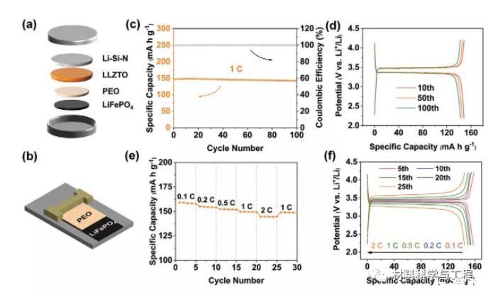 圖5.a,b)全固態Li-Si-N|LLZTO|PEO-LiFePO4電池的制備和組裝示意圖。