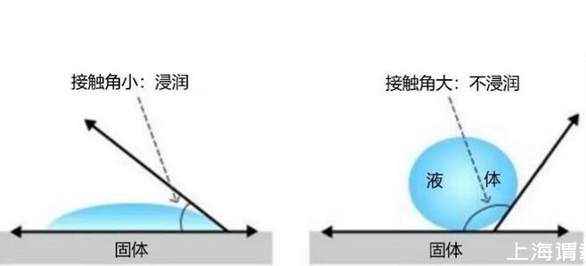 液體接觸固體表面的瞬間,如果附著力大于表面張力,那么界面上的液體分子就會被緊緊拽到固體表面,使液體與固體表面之間的接觸面積增大,接觸角減小,即發生浸潤現象。