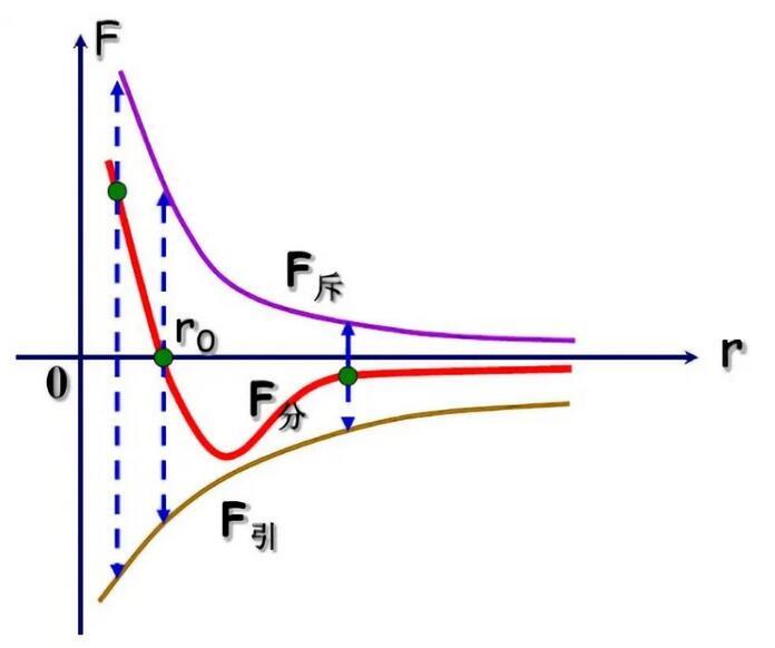 關于分子間作用力的組成、產生原因等十分復雜,今天并不去過多介紹。不過我們需要了解的是,在分子間作用力的影響因素中,分子間距是極其重要的一個。兩者具體的關系如下圖所示: