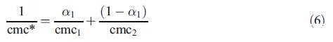 為了討論由兩種二元混合物形成的混合膠束的性質,即混合膠束是否顯示理想或非理想行為,我們使用了偽相分離模型[19]。根據該模型,膠束被認為是與含有相應單體的溶液平衡的宏觀相。對于二元表面活性劑混合物,理想cmc由方程[19]關聯: