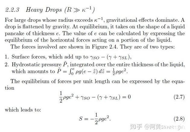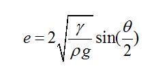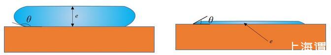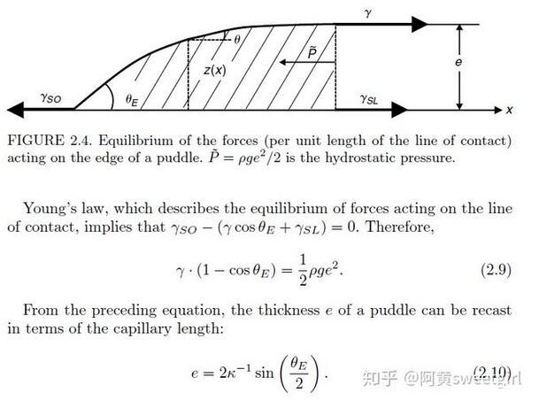 有意思的是,已經(jīng)有前人對這種情形做過詳細的受力分析。得出只要接觸角一定,此時無論加多少水,液體的厚度e都不會增加,只會增加鋪展的面積。其厚度e的表達式為:
