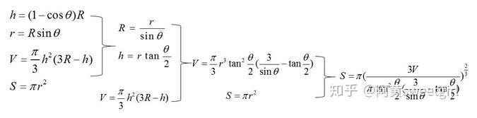 此時根據(jù)球的體積公式,以及簡單的三角函數(shù)變換,就可以得出S與V和θ的關(guān)系,具體推導過程如圖2所示。