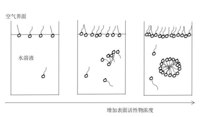 我們在文章開頭介紹過,表面活性劑是一種兩親的分子,一頭親水一頭親油。因此,低濃度時表面活性劑傾向于留在水的表面,親油(厭水)的一頭朝外,首先布滿水面,也就是水-空氣界面,所以會降低這個界面的張力。