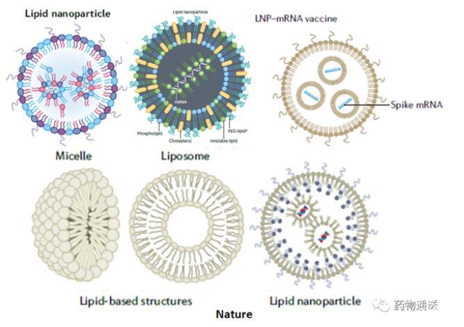 首先在是Nature系列期刊中,就存在兩種明顯不同的示意圖,有的mRNA-LNP示意圖是單層膜結構,而有的文章則描述為雙層膜結構。Vaccines和Science期刊中描述的mRNA-LNP示意圖則類似于脂質體結構,為雙分子層結構。Biotechnology Advances和Journal of Controlled Release期刊則選用了單層膜的mRNA-LNP示意圖。
