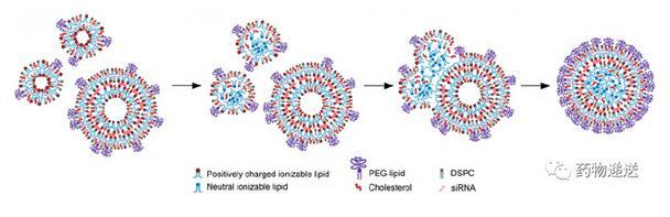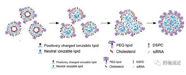 在有siRNA存在的情況下,最初是在緊密相連的脂質單層之間形成包含siRNA的小囊泡;隨著pH值的升高,類似于不含siRNA的LNP,可電離脂質電位的中和會誘導脂質顆粒間的融合,這個過程受到復合物中PEG脂質、DSPC和膽固醇的相分離限制;有科學家提出,這些脂質沉積在表面單層,抑制脂質顆粒進一步融合。值得注意的是,高濃度乙醇(體積比不小于25%)會導致除單個脂質分子的高交換率(與siRNA復合的陽離子脂質除外),從而使得快速形成平衡結構;還需要指出的是,必須要有部分DSPC和膽固醇被分割在外單層,并且在pH=4時能維持更小結構的穩定,因為在含有1.5 mol % PEG脂質且沒有DSPC或膽固醇的體系中能觀察到非常大的微米級系統;隨著pH的升高,納米顆粒經歷的過程與不含siRNA時LNP的情況基本相同;可電離脂質向中性形式轉化的過程更利于增加在LNP內核中的融合和沉積。