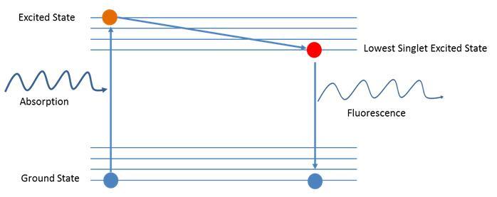 染料分子需要在接收到特定波長的光之后,才能從基態(tài)到激發(fā)態(tài),電子再迅速回到基態(tài),這個(gè)過程損失的能量就會(huì)以另一個(gè)特定波長光的形式釋放,在視頻中的例子就是吸收約350nm的紫外線,再放出藍(lán)色的可見光。