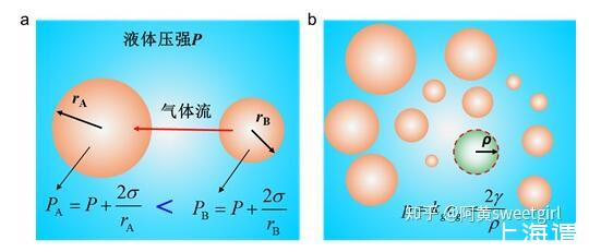 氣泡液體是大小不同的球狀氣泡分散到液體中的液氣體系。在氣泡液體中,大小不同氣泡是一個(gè)不穩(wěn)定的體系,其內(nèi)部不等的壓強(qiáng)會(huì)使整個(gè)體系變化,總體趨勢(shì)是氣泡半徑出現(xiàn)粗化現(xiàn)象,這種粗化跟晶體生長(zhǎng)中的Ostwald熟化的現(xiàn)象是一致的(Ref 1)。根據(jù)附加壓力公式,可知較小的氣泡其內(nèi)部具有較大的壓強(qiáng),因此與旁邊較大的氣泡間就會(huì)存在壓強(qiáng)差(圖1a),氣泡間液體兩側(cè)的壓強(qiáng)差會(huì)使氣體從壓強(qiáng)較大的地方向較小的地方擴(kuò)散,從而出現(xiàn)大的氣泡增大,小的氣泡減小直至消失的情形,這就是氣泡Ostwald熟化的機(jī)理(Ref 2)。從能量的觀點(diǎn)來說,Ostwald熟化的結(jié)果降低了體系的表面能,從而使整個(gè)體系更加穩(wěn)定。