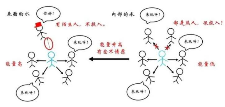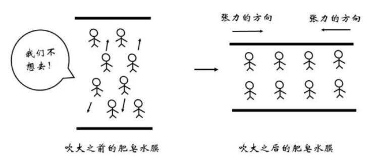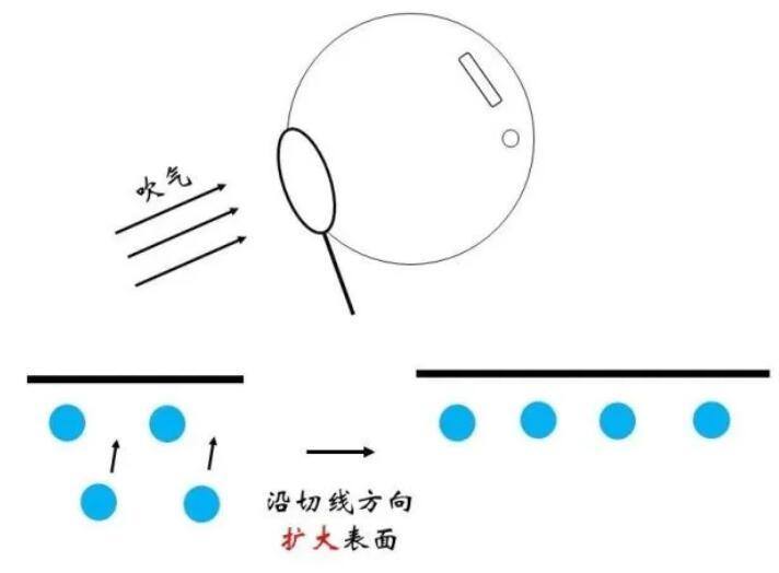 俗話說“物以類聚,人以群分”,更加相似的同類分子間往往關(guān)系更為融洽,而不同種分子間的關(guān)系則相對(duì)疏遠(yuǎn)。在物理上表現(xiàn)為同類分子間的勢(shì)能曲線最低點(diǎn)更低。因此,對(duì)于一個(gè)存在于內(nèi)部的水分子,如果來到表面,需要斷開與同類分子的部分關(guān)系,而代之以與比較“生疏”的空氣分子間的作用,顯然是不情愿的!這體現(xiàn)為能量的升高。那么,什么情況下水分子要從內(nèi)部來到表面呢?正是吹泡泡的時(shí)候。