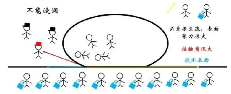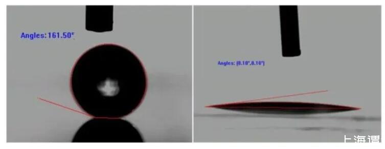 反之,對(duì)于疏水表面,固液界面處的表面張力可能非常大,以至于接觸角只有達(dá)到鈍角甚至趨近于180°才能達(dá)到平衡,此時(shí)的現(xiàn)象稱為非浸潤或者不能浸潤。而這種表面由于較高的疏水性被稱為超疏水表面。