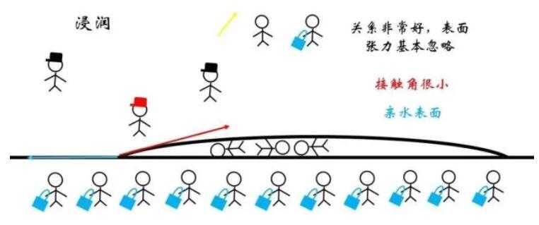 對(duì)于浸潤的情況,液體與固體物質(zhì)間的關(guān)系很好,最為極端地可以認(rèn)為該界面處的表面張力小到可以忽略。這樣一來,需要紅色和藍(lán)色的力的水平分量達(dá)到平衡,液滴的形狀趨于扁平。一般將氣液界面處張力與液固界面的夾角稱為接觸角,對(duì)于浸潤現(xiàn)象顯著的親水表面接觸角很小。