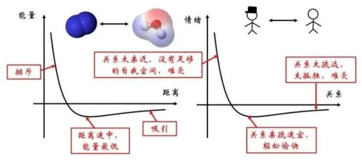 在微觀世界存在著多種多樣的分子,比如上圖所示的氮?dú)馀c水分子。分子間組成的體系的勢(shì)能與分子間的距離有關(guān)。這種關(guān)系正如兩個(gè)人之間的關(guān)系,遠(yuǎn)了近了都不好。如果距離太近,彼此之間沒了自我空間,情緒會(huì)不穩(wěn)定,因此會(huì)產(chǎn)生相互排斥的作用;如果距離太遠(yuǎn),每個(gè)人都太孤獨(dú),便會(huì)相互思念,彼此吸引。當(dāng)彼此的距離恰到好處,便對(duì)應(yīng)著能量的最低點(diǎn),較為穩(wěn)定。