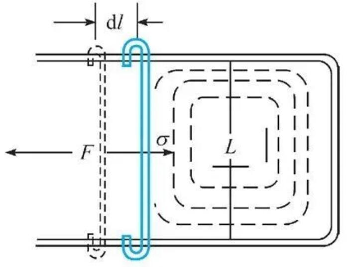 我們?cè)?jīng)提到比表面能的單位是J/m,而將這個(gè)物理量從力的角度去理解對(duì)于處理一些問題更加直觀,我們常常將比表面能稱為表面張力。而J/m=N/m,并不是力的單位N,因此表面張力代表的是作用在單位長(zhǎng)度的表面上的力。在下圖所示的實(shí)驗(yàn)中,肥皂水膜在力F的牽拉下長(zhǎng)大,表面張力便是