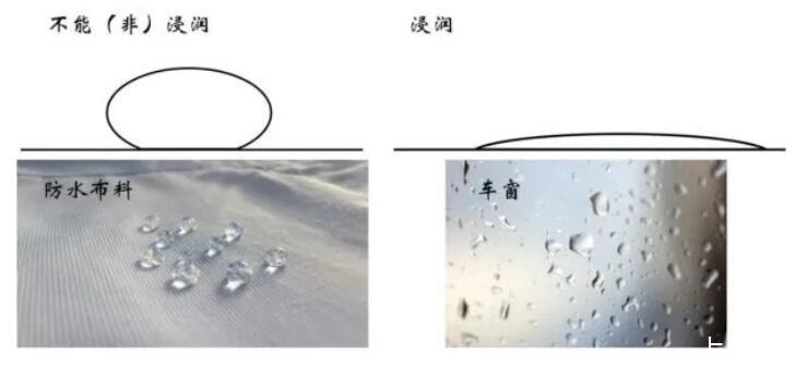 浸潤現(xiàn)象,這個(gè)詞可能大家比較陌生,但是對(duì)應(yīng)的物理現(xiàn)象非常常見。比如下圖所示的防水衣服以及公交車車窗上的水滴就是非浸潤和浸潤代表性的場(chǎng)景。