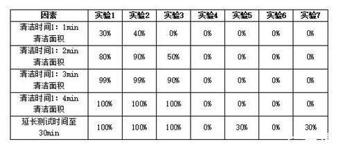通過實驗1我們發現:在浸泡清洗中各組分均能達到較好的清潔效果,但各組分最終清潔時間有差異,具體數據如下表