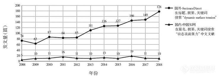 當研究的液體吸附過程在快速、持續進行,且短時間內無法達到平衡時,對液體DST的研究比靜態表面張力更有意義。如在農藥噴灑、噴墨印刷、織物快速潤濕,以及攝影用薄膠片制備中。圖1對比了近10年(2008~2018年)國內外發表的以DST為主要考察項的論文數。數據顯示國內在DST方面的研究較少且總體波動不大,而國外則呈持續上升趨勢。