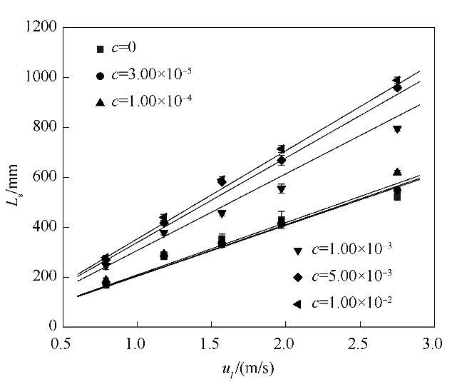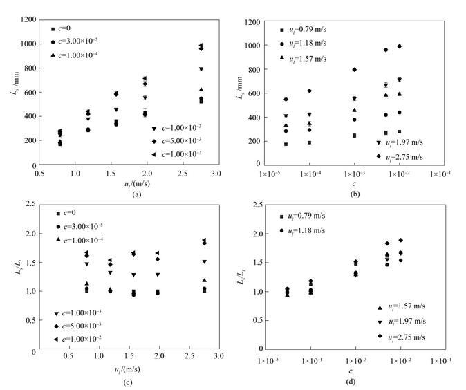 為了定量表征表面張力變化對(duì)射流破裂過程的影響,實(shí)驗(yàn)測(cè)量了含表面活性劑射流的射流破裂長度。射流破裂長度定義為噴嘴出口至射流首次發(fā)生破裂處的距離。圖6是含表面活性劑射流破裂長度隨射流速度u l的變化趨勢(shì),其中L s(mm)表示含表面活性劑射流的射流破裂長度,L l(mm)為水的射流破裂長度。從圖6(a)中可以看出,當(dāng)表面活性劑濃度保持不變時(shí),提高液體射流速度會(huì)增大射流破裂長度。從圖6(b)中可以看出,當(dāng)液體射流速度保持不變時(shí),隨著表面活性劑濃度的增大,射流破裂長度總體上呈現(xiàn)逐漸增大的趨勢(shì);射流速度越大,射流破裂長度增大的趨勢(shì)就越明顯。使用相同工況下水的射流破裂長度無量綱化含表面活性劑射流的破裂長度后,可以得到射流破裂長度比隨射流速度以及表面活性劑濃度的變化趨勢(shì),如圖6(c)、(d)所示。從圖中可以看出,表面活性劑的加入顯著增大了射流破裂長度比。在表面活性劑濃度不變時(shí),提高液體射流速度對(duì)射流破裂長度比的影響并不顯著。在射流速度保持不變時(shí),提高表面活性劑濃度會(huì)導(dǎo)致射流破裂長度比的增大。