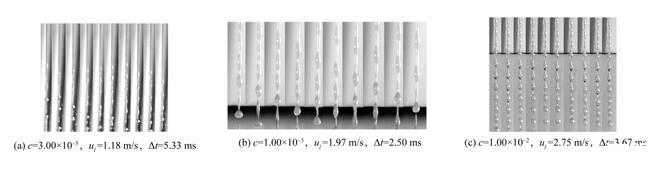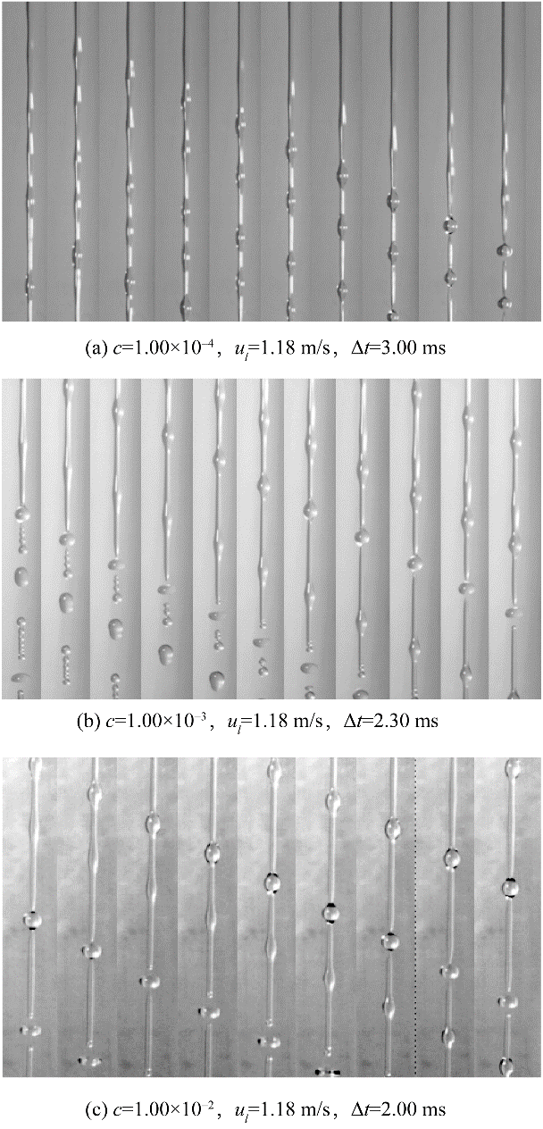 本文首先研究了不含氣泡的表面活性劑射流破裂過程以探究表面張力變化對(duì)射流破裂特征的影響。實(shí)驗(yàn)使用高速相機(jī)記錄了六種不同濃度表面活性劑溶液的射流破裂過程。實(shí)驗(yàn)獲得的射流破裂過程如圖5所示,其中Δt是相鄰兩張圖片間的時(shí)間間隔。從圖5中可以看出,雖然表面活性劑濃度并不相同,但射流的破裂過程在形態(tài)上是相似的。當(dāng)液體射流離開噴嘴后,射流表面擾動(dòng)迅速增長,表面波動(dòng)在射流表面呈對(duì)稱分布,這是射流破裂Rayleigh區(qū)的典型特征。隨著表面波動(dòng)的進(jìn)一步發(fā)展,在射流方向上,射流表面形成瘤狀結(jié)構(gòu),射流破裂發(fā)生在兩個(gè)瘤狀結(jié)構(gòu)之間。