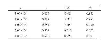 圖4展示了不同SDBS濃度下lg S隨lg t的變化規(guī)律,圖中實(shí)線對(duì)應(yīng)各濃度下動(dòng)態(tài)表面張力的擬合曲線,此時(shí)圖中時(shí)間t的單位為ms。從圖中可以看出,擬合結(jié)果與實(shí)驗(yàn)數(shù)據(jù)吻合較好,擬合曲線能夠較好地表征動(dòng)態(tài)表面張力的時(shí)間演變趨勢(shì)。擬合得到的系數(shù)見表1。