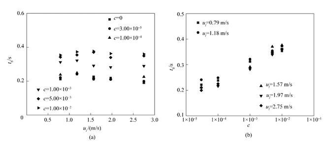 從圖7(a)中可以看出,當(dāng)表面活性劑濃度保持不變時(shí),射流破裂時(shí)間幾乎不隨射流速度的改變而改變。在射流速度保持不變時(shí),隨著表面活性劑濃度的增大,射流破裂時(shí)間呈現(xiàn)逐漸增長的趨勢(shì)。在實(shí)驗(yàn)參數(shù)范圍內(nèi),射流破裂時(shí)間均小于0.4 s??紤]重力對(duì)液體射流的加速作用,液體射流實(shí)際破裂時(shí)間要小于0.4 s。