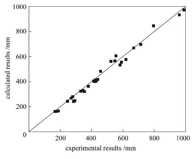 圖9射流破裂長度實(shí)驗(yàn)測(cè)量值與擬合計(jì)算值的比較Fig.9Comparison between experimental results and calculated results