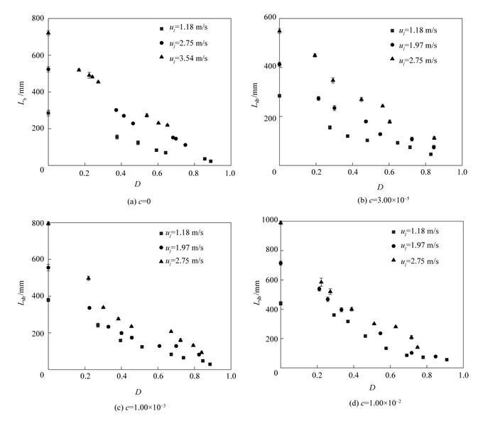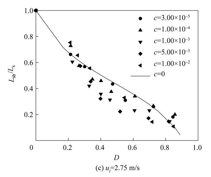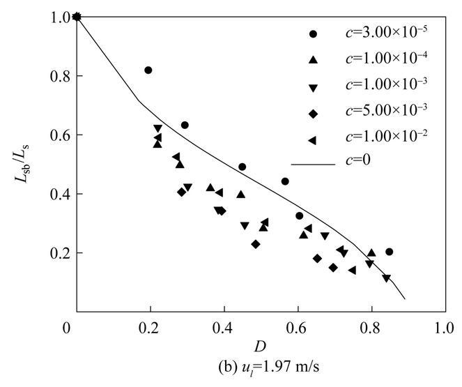 圖11是不同濃度表面活性劑射流破裂長度L sb隨氣泡無量綱直徑D=d b/d 0(d b為氣泡直徑)的變化。從圖中可以看出,不同表面活性劑濃度下,射流破裂長度隨氣泡無量綱直徑D的變化趨勢(shì)是相似的。射流破裂長度隨著氣泡直徑的增大逐漸減??;當(dāng)氣泡直徑相同時(shí),提高液體射流速度會(huì)導(dǎo)致更大的射流破裂長度。