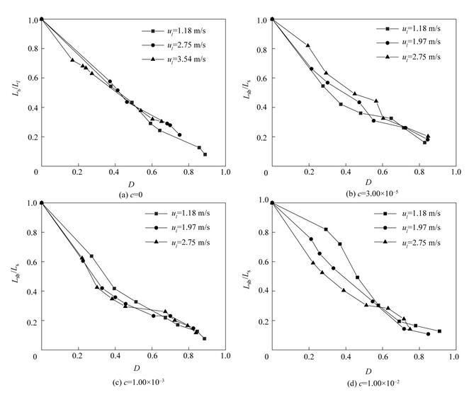 如圖12所示,當(dāng)氣泡直徑較大時(shí),破裂長度比基本不隨射流速度的改變而改變。這是由于此時(shí)氣泡引起的射流速度擾動(dòng)對(duì)射流破裂的影響占主導(dǎo)地位。在氣泡直徑較小時(shí),當(dāng)表面活性劑濃度c<1.00×10-2,不同射流速度下射流破裂長度比基本相同。當(dāng)表面活性劑濃度c=1.00×10-2,破裂長度比隨著射流速度的增大而逐漸減小。這可能與被削弱的Marangoni效應(yīng)有關(guān)。由式(10)可知,液體射流速度越大,液體對(duì)流造成的表面活性劑表面吸附量減少的趨勢(shì)越強(qiáng),波峰波谷間的表面張力差值越小,Marangoni效應(yīng)越弱,射流破裂長度增加的趨勢(shì)越弱。因此,在氣泡較小時(shí),隨著射流速度的增大,含氣泡射流的破裂長度比逐漸減小。在表面活性劑濃度較小時(shí),氣泡的存在進(jìn)一步減小了射流內(nèi)部表面活性劑的濃度,從而使得不同射流速度下Marangoni效應(yīng)的差別不明顯,不同射流速度下射流破裂長度比基本相同。
