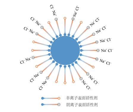 抑塵劑主要由陰離子表面活性劑、非離子表面活性劑以及其他助劑組成。其中,表面活性劑是一種具有兩親性的物質,加入少量能使其溶液體系的界面狀態發生明顯變化,是抑塵劑的重要組成部分。如圖4所示,煤塵表面暴露著大量的極性有機基團,水在煤塵表面很難發生潤濕行為;抑塵劑中的表面活性劑親油端與煤塵表面的有機基團具有較好的相容性,能夠在煤塵表面定向排列并且將親水基團引入煤塵表面,增加了水與煤塵之間的潤濕能力。無機鹽的引入對于陰離子表面活性劑具有增效作用。根據雙電層理論,雙電層可以分為緊密層和擴散層,當溶液中加入無機鹽后,無機鹽中的離子會壓縮擴散層,使得擴散層厚度減小,從而降低了界面能;同時其無機鹽離子還能減小雙電層中的靜電力作用,促進了抑塵劑在煤塵表面的吸附,提高了潤濕性能。