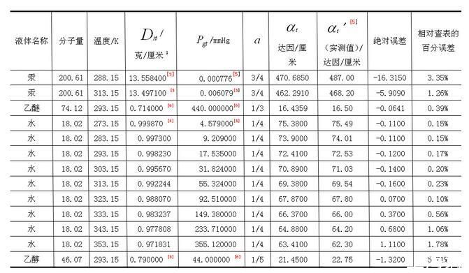 其中N0為阿伏伽德羅數(shù),M為摩爾質(zhì)量,Dit是液體的密度,Dgt是液體飽和蒸汽的密度,a為與液體種類相關(guān)的常量。為驗(yàn)證(1)式的正確性,對(duì)汞、乙醚、水、乙醇等實(shí)際液態(tài)物質(zhì)的表面張力系數(shù)進(jìn)行理論計(jì)算,并與實(shí)驗(yàn)實(shí)測(cè)值'相比較,列于下表【3】: