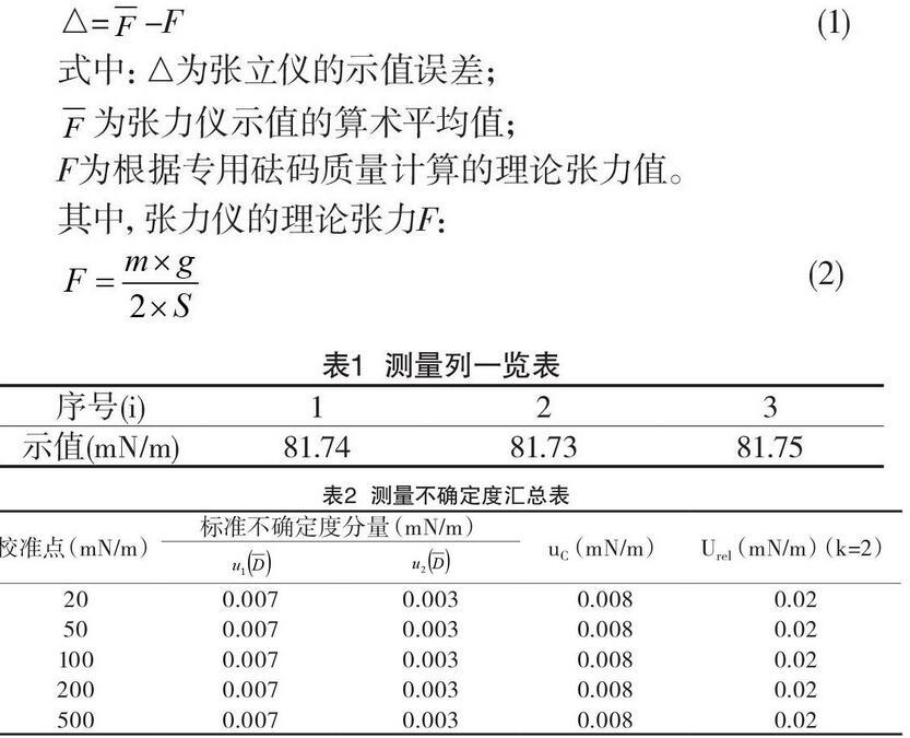 根據(jù)JJF 1464-2014《界面張力儀校準規(guī)范》規(guī)定,張力儀的測量范圍為20~500mN/m,其測量不確定度見表2。