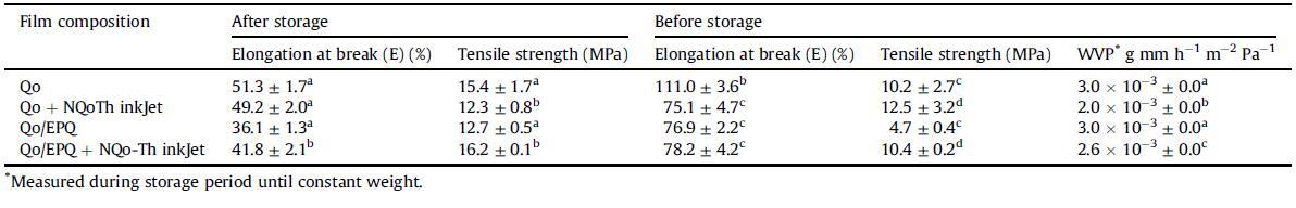沒有NQoThs的Qo和Qo/EPQ薄膜在85%RH和0降溫下的WVP值沒有顯著差異(p>0.05)。通過印刷添加4層NPs后,Qo薄膜的WVP降低了33%,混合薄膜的WVP降低了13.3%。WVP的這種降低是由于添加NP導致系統(tǒng)曲折增加(Adame和Beall,2009年;Clapper等人,2008年)。