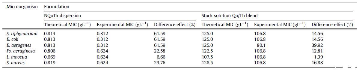 本研究的一個目標是確定對微生物的影響是否是由于組分的協(xié)同或相加作用。通過根據(jù)NQoThs中存在的百分比(QoLMW為75%,Th為25%)對QoLMW和Th的MIC進行加權,將NQoThs的MIC與附加效應的估計值進行比較。NPs(NQoTh)和QoLMW/Th原液的MIC值均低于基于組分加和效應估計的MIC,表明Qo和Th之間存在協(xié)同效應(見表5)。然而,取決于測試的細菌,NPs的MIC比庫存QoLMW/Th混合物低大約1.5到4.5倍。Wazed Ali、Rajendran和Joshi(2011)評估了使用TPP從440-kDa Qo的1.0%(w/v)溶液中產生的NQo(115.5 nm)的AM抗金黃色葡萄球菌。NQo比Qo原液更有效地抑制這些細菌的生長50%。