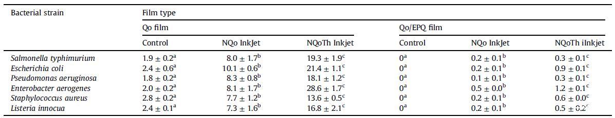 表6通過熱噴墨將NQo和NQoTh結合到Qo和Qo/EPQ薄膜中的徑向擴散的生長抑制區(qū)(mm2)。對于每種納米顆粒溶液,薄膜印刷4次。不同字母表示顯著差異(p<0.05)。