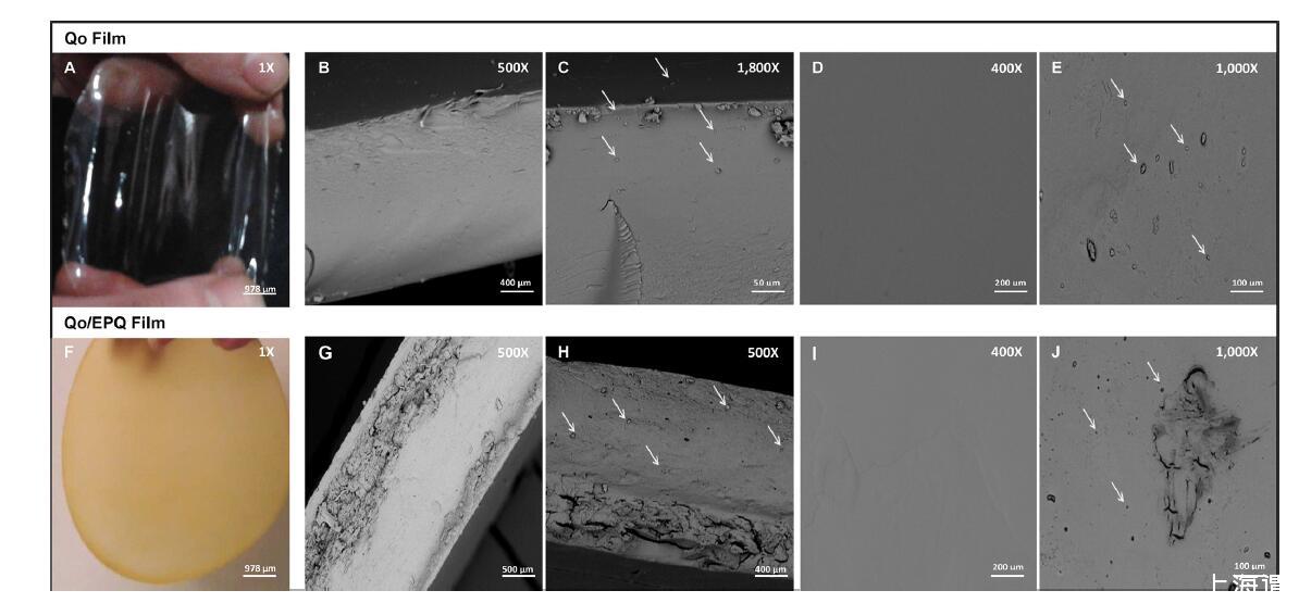 Qo膜的表面(圖3D)光滑平整,沒有孔隙或裂縫。幾位作者報告了Qo薄膜的高度結構同質性(Abugoch等人,2011年;Fern?andes、Freire、Silvestre、Neto、Gandini等人,2010年;Valenzuela等人,2013年;Vargas、Albors、Chiralt和
