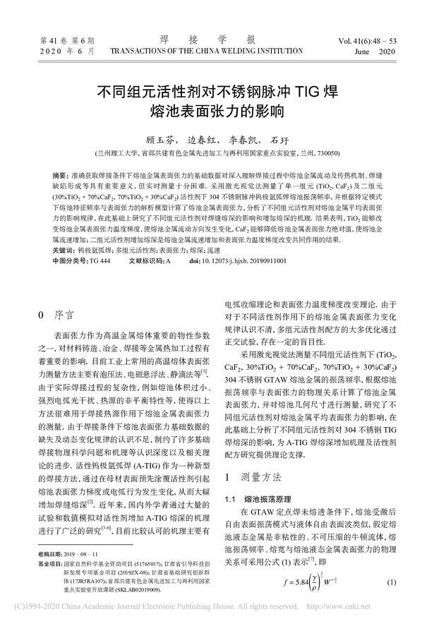 【摘要】:準確獲取焊接條件下熔池金屬表面張力的基礎數據對深入理解焊接過程中熔池金屬流動及傳熱機制、焊縫缺陷形成等具有重要意義,但實時測量十分困難。采用激光視覺法測量了單一組元(TiO_2,CaF_2)及二組元(30%TiO_2+70%CaF_2,70%TiO_2+30%CaF_2)活性劑下304不銹鋼脈沖鎢極氬弧焊熔池振蕩頻率,并根據特定模式下熔池特征頻率與表面張力的解析模型計算了熔池金屬表面張力,分析了不同組元活性劑對熔池金屬平均表面張力的影響規律,在此基礎上研究了不同組元活性劑對焊縫熔深的影響和增加熔深的機理。結果表明,TiO_2能夠改變熔池金屬表面張力溫度梯度,使熔池金屬流動方向發生變化,CaF_2能夠降低熔池金屬表面張力絕對值,使熔池金屬流速增加;二組元活性劑增加熔深是熔池金屬流速增加和表面張力溫度梯度改變共同作用的結果。