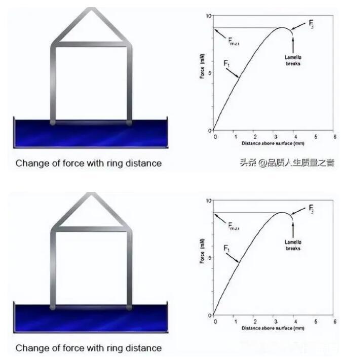 由于距離不同表現出的表面張力也不同,因此測量往往取最大值,也就是右方圖中的Fmax