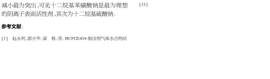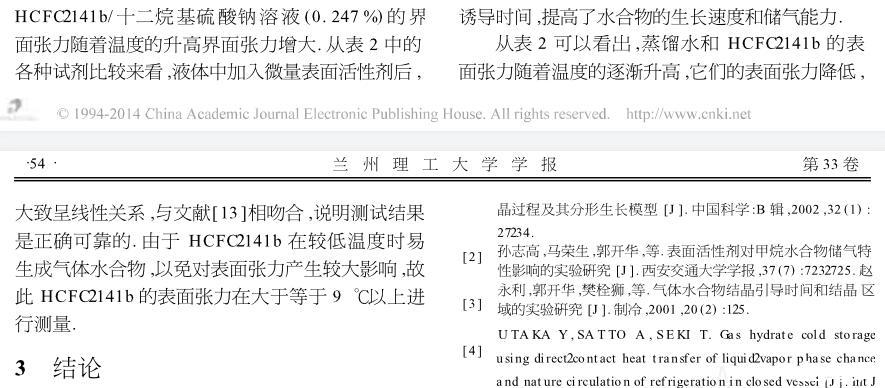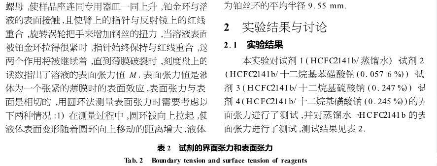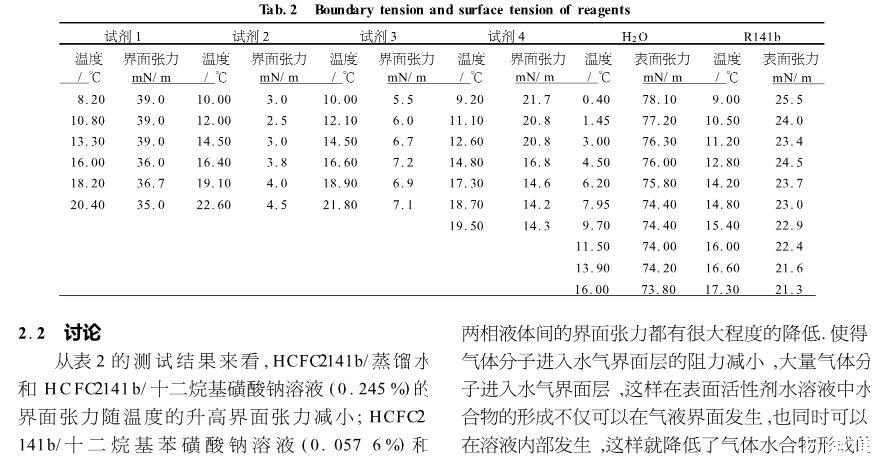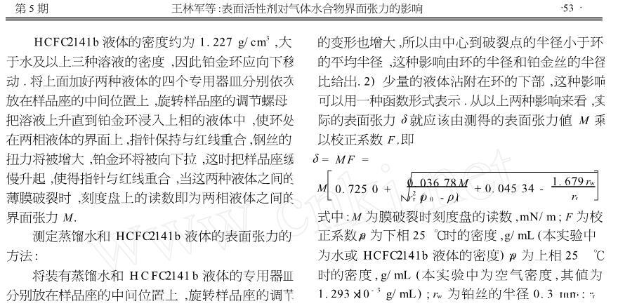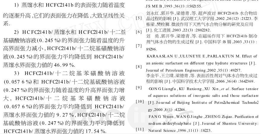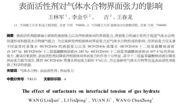 【摘要】:表面活性劑能夠減小液體的表面張力以及兩相液體間的界面張力,界面張力的減小有利于促進(jìn)氣體水合物快速形成和提高水合物儲(chǔ)氣能力.為定量研究兩相液體間界面張力對(duì)氣體水合物形成的影響,用界面張力儀實(shí)測不同溫度時(shí)蒸餾水、HCFC-141b的表面張力以及HCFC-141b/蒸餾水、HCFC-141b/十二烷基硫酸鈉溶液(0.247%)、HCFC-141b/十二烷基磺酸鈉溶液(0.245%)、HCFC-141b/十二烷基苯磺酸鈉溶液(0.057 6%)的界面張力,測試結(jié)果表明,表面活性劑對(duì)降低兩相液體間界面張力的作用十分明顯,其中十二烷基苯磺酸鈉溶液對(duì)降低界面張力最為突出,降到HCFC-141b/蒸餾水界面張力值的9%左右,為定量研究氣體水合物等優(yōu)選表面活性劑提供了科學(xué)的依據(jù)。