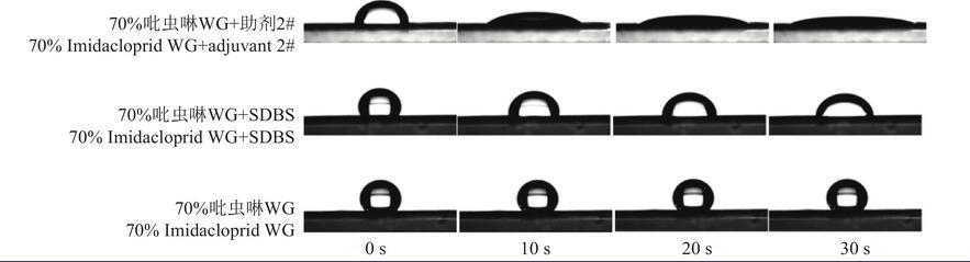 試驗過程中發現,添加各供試助劑后的藥液液滴在小麥葉片正、反面上的展布行為基本相似,但展布的速率和面積不同,因此以加入助劑2#和SDBS的吡蟲啉藥液在水平放置的小麥葉片上的鋪展情況(圖4、5)為例,說明添加不同助劑后藥液在小麥葉片上的鋪展行為。藥液液滴以零速度放置于小麥葉片上,長軸方向平行于葉脈,展布速度較快,短軸方向垂直于葉脈,展布速度較慢,且鋪展面積在20 s左右趨于穩定。由圖4、5可知:添加了助劑2#的藥液因其表面張力下降至21.98 mN/m,小于小麥葉片正反面的表面張力,可以在小麥葉片潤濕展布,隨時間變化接觸角減小,展布程度增大;而添加了SDBS助劑和未添加助劑的藥液表面張力大于小麥葉片的表面張力,在小麥葉片上不鋪展或鋪展速度較慢。在農藥使用過程中,藥液在小麥葉面上的展布性越好,鋪展的面積就越大,相應的防治面積也就越大,藥液黏附于作物葉面上的可能性就越大,從而減少了農藥流失進入環境的概率,大大地提高農藥利用率和施藥效果。