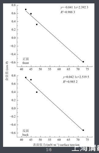 臨界表面張力是固—液界面化學中表征固體表面能的一個重要指標,用以說明液體在固體表面的可潤濕性。通過ZISMAN圖法[22]以接觸角的cosθ對液體表面張力作圖得到接觸角與表面張力的回歸直線如圖1所示:求得方程分別為y=?0.041 1 x+2.392 3和y=?0.042 1x+2.519 5。將圖中直線外延至cosθ=1處,得出小麥葉片正、反面的臨界表面張力值分別為33.88和36.08 mN/m,與顧中言等[21]研究結果幾乎一致。從測定結果可以看出:小麥葉片的反面表面張力值比正面大,更容易被潤濕;但小麥葉片正、反面的表面張力估值較小,即表面自由能較低,較難被潤濕。