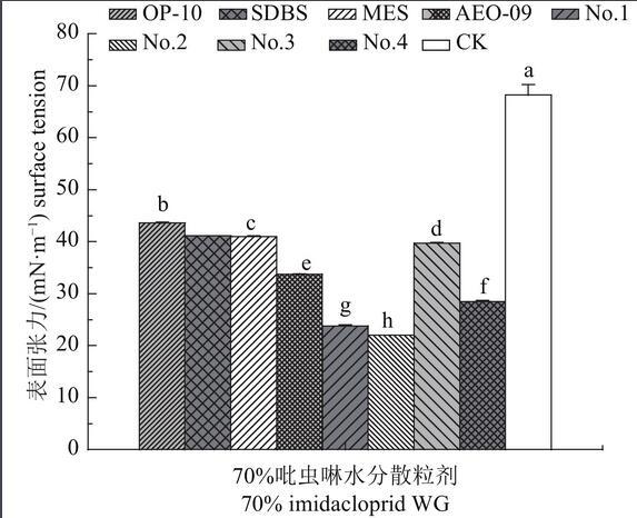 表面張力的大小直接決定了農藥制劑在稀釋后能否完全潤濕展布在植物表面上,而降低表面張力的常用方法就是在制劑中添加助劑。本次試驗通過添加不同助劑測定了供試農藥表面張力值的變化,結果如圖2所示。70%吡蟲啉WG藥液的表面張力值為(68.21±2.03)mN/m,加入助劑后顯著降低了藥液的表面張力,且不同助劑對同一種藥液的表面張力降低趨勢存在顯著差異。其中,篩選出的8種助劑中,助劑1#和2#對藥液表面張力下降趨勢最大,效果最好,降低率分別可達65.13%和67.78%;其次是助劑4#、助劑3#、AEO-09和SDBS,降低率范圍在32.84%~63.96%;脂肪酸甲酯磺酸鈉和OP-10較差,但降低率也可達26.58%以上。加入助劑1#、2#和4#后,藥液的表面張力降低至小麥葉片正面的臨界表面張力(33.88 mN/m)以下,能較好潤濕展布在小麥的葉片正、反面上,極大地增加施藥效果。