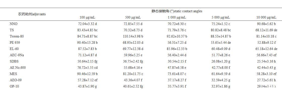 表3不同質量濃度的助劑溶液在小麥葉正面上的靜態接觸角(mean±SD,n=5)