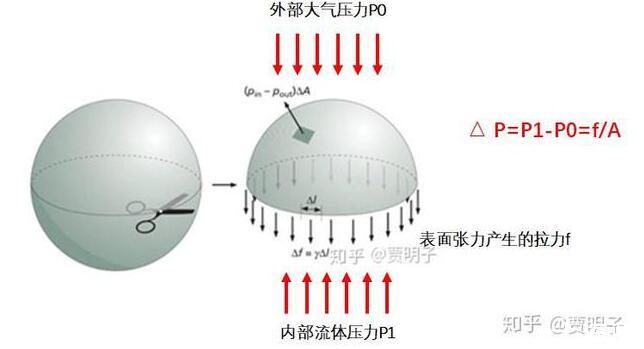 而這里有一件非常關(guān)鍵的事請(qǐng),就是由于表面張力的存在,彎曲的表面就會(huì)在兩側(cè)形成壓力差。就好像緊繃的氣球,其內(nèi)部壓力要高于外部的壓力。這種壓力差來(lái)自哪里?當(dāng)然就是氣球皮膜緊繃的張力。由于氣球的彎曲表面,使得其張力最終表現(xiàn)為內(nèi)部壓力的升高。