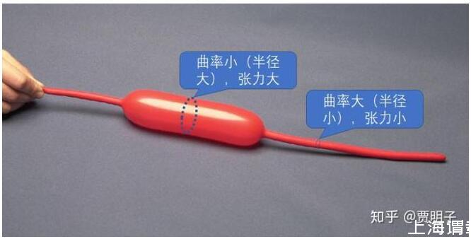 氣球內(nèi)部的氣體壓力處處相等,但是,接觸過(guò)這種氣球的人都有一個(gè)經(jīng)驗(yàn),就是粗的地方繃得緊,而細(xì)的地方繃得就不那么緊。如上圖所示,繃得緊的地方和繃得松的地方,產(chǎn)生的壓力差是相等的,但是他們的曲率是不相等的:曲率越大,同樣的張力所能產(chǎn)生的壓力差就更大。