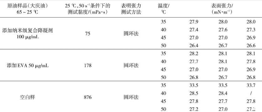 從表1可以看出,處理后添加納米級復合降凝劑100μg/mL大慶油樣、添加傳統EVA降凝劑50μg/mL大慶油樣、大慶空白油樣在25℃、50 s-1測試條件下的黏度是依次升高的,添加納米級復合降凝劑100μg/mL的大慶油樣品黏度最低,為75 mPa·s。相同的測試溫度條件下,黏度越大的油樣表面張力越大。其中,空白油表面張力最大,添加傳統EVA降凝劑的油樣次之,添加納米級復合降凝劑的油樣最小。原油油品的表面張力隨著溫度的降低而增大。